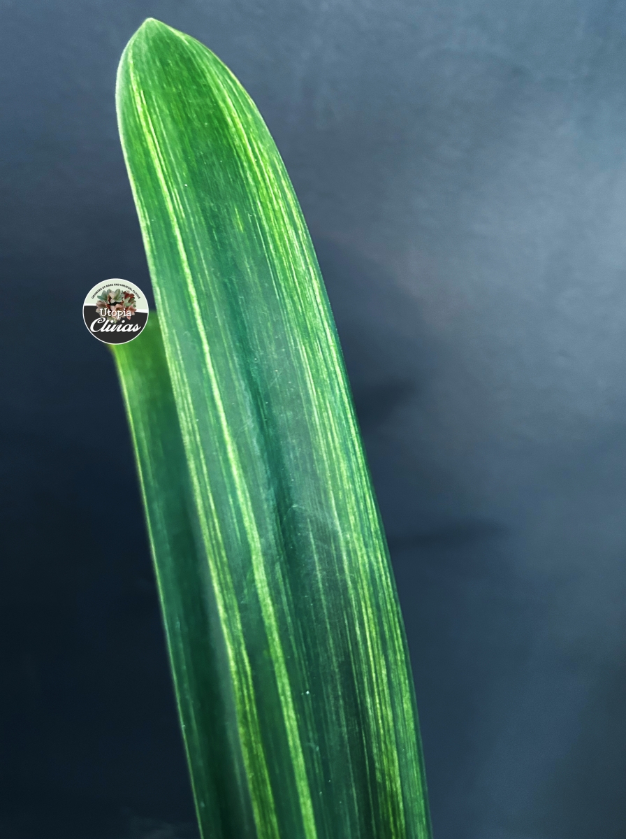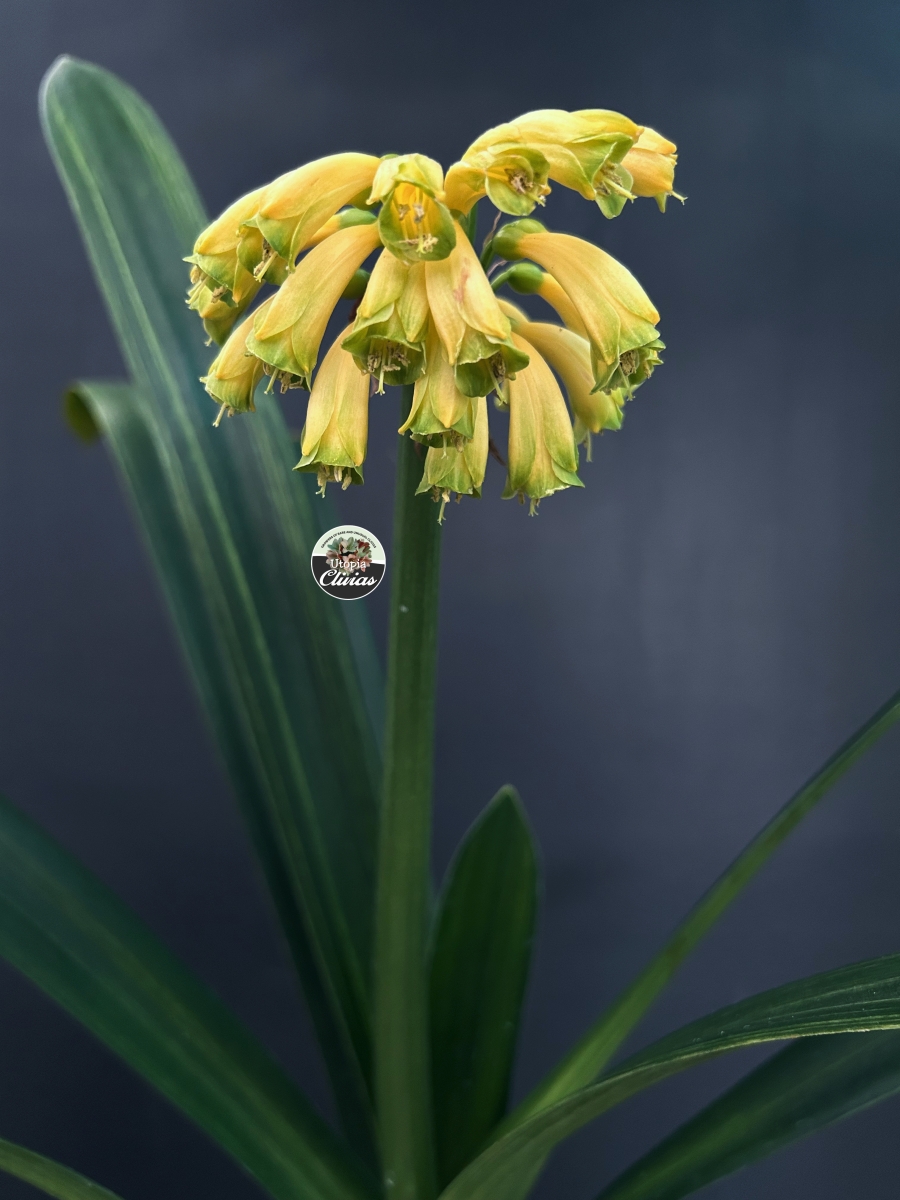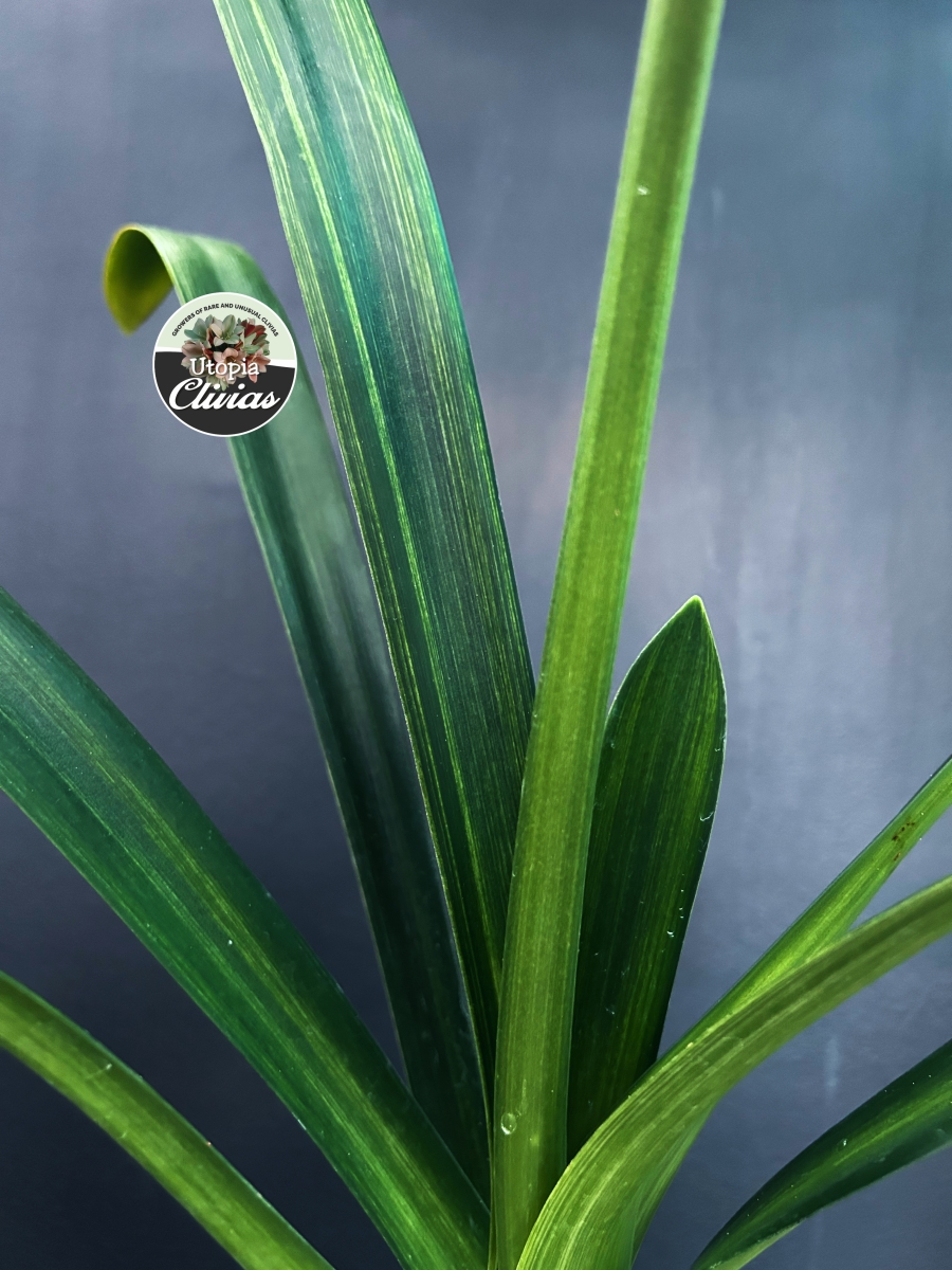 At Utopia Clivias, we are fortunate to cultivate an extremely rare variegated yellow Clivia caulescens, grown from seed. This plant represents a naturally occurring genetic mutation, highlighting the remarkable diversity and unpredictability within the species.