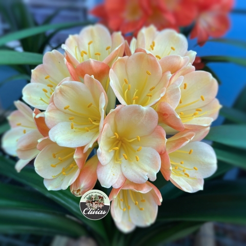 Tiger Variegated — rare and highly prized Clivia miniata cultivar featuring bold horizontal or diagonal striping across the leaves, reminiscent of a tiger’s coat. Bred to produce Chinese Blushes with Tiger and variegated leaves.